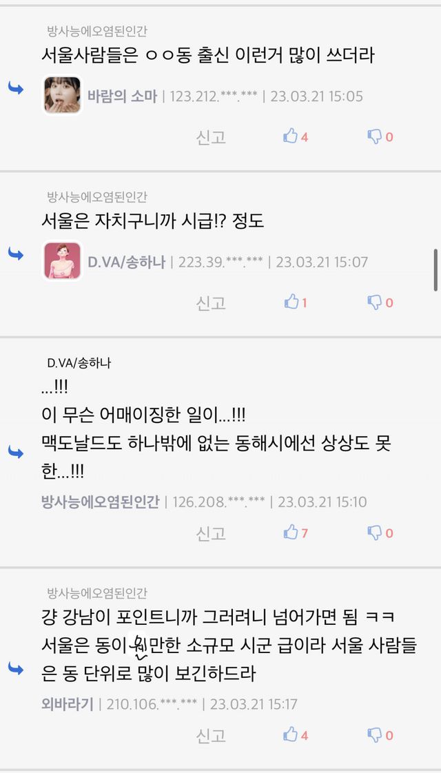 서울에서 딱 행정구역 단위로 자르지 않더라도 자기 집 기준위아래로 2블럭 정도로만 잘라서 거기 없으면 우리동네에 없다 라고 말하는 경향이 있음…