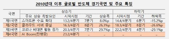 코로나19를 거친 제 3국면도 높은 상승 폭(29.7%)을 기록했다. 비대면 활동이 늘어 전반적인 IT 제품 수요가 증가한 시기다. 다만, 수요 약화로 공급 과잉이 왔을 때 하락 폭과 기간도 더 큰 것으로 나타났다. 제 1국면 때는 총 6분기 동안 15%가 하락했다면, 제 2국면 때는 8분기 동안 27% 내렸다.