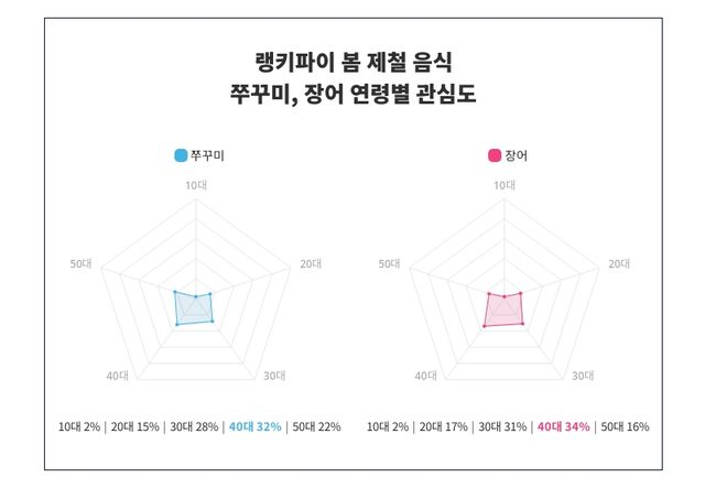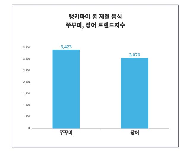 랭키파이의 분석에 따르면, 쭈꾸미가 봄 제철 음식 트렌드지수에서 '3,423포인트'로 1위를 차지했다. 이어 장어가 '3,070포인트'로 2위를 기록했다. 두 트렌드 사이의 지수 차는 '353포인트'로 나타났다.