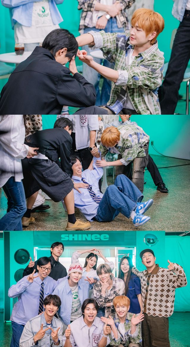 공개된 사진 속에는 ‘놀면 뭐하니?’ 멤버들과 만난 샤이니 온유, 키, 민호, 태민의 모습이 포착돼 눈길을 끈다. 특히 온유는 오랜만의 예능 출연이 어색해 적응에 진땀을 흘리는 모습으로 모두의 집중 관심을 받는다.