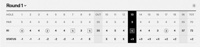 셰플러를 한방에 보낸 홀은 13번홀. 파3, 157야드로 그린앞에는 냇물이 흐른다. 전반에 버디와 보기를 2개씩 주고 셰플러는 13번홀에서 티샷한 볼이 바람탓에 148야드 밖에 날아가지 못해 그린앞 물에 퐁당 빠졌다. 패널티 구역에서 친 볼도 101야드만 날아가 그린앞 러프에 빠졌다. 칩샷도 짧아 홀에 못 미쳤다. 이것을 2퍼트나 해 뼈아픈 더블보기를 범했다.