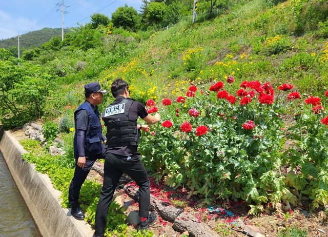 현장에는 나무 받침 등이 설치되어 있어 누군가 양귀비를 불법으로 재배한 흔적이 발견됐다.