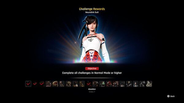 보스 공략 이후로는 클리어 타임과 더불어 퍼펙트 패링·회피 성공 횟수, 탄약 사용량, 전투 소모품 사용량, 회복 소모품 사용량 등의 기록이 누적되며, 노말 난이도 이상으로 챌린지 내 모든 보스를 무찌를 경우 신규 나노슈트 ‘뉴로링크 슈트’를 획득할 수 있다. 이외에도 흑백 두 가지 색상의 ‘쿠노이치 슈트’가 패치를 통해 추가된다.