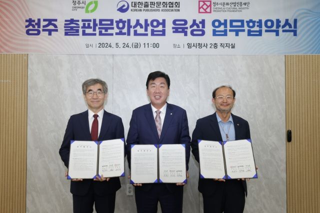 청주시와 청주시문화산업진흥재단은 24일 오전 11시 청주시청 임시청사 직지실에서 (사)대한출판문화협회와 청주 스토리콘텐츠산업 육성과 지원을 위한 3자 업무협약을 체결했다.