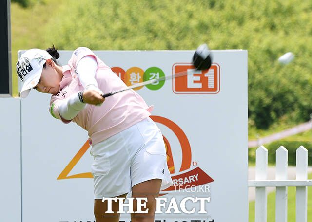 KLPGA투어 E1채리티 오픈 1라운드가 24일 경기도 여주시 페럼클럽CC에서 열린 가운데 지한솔이 1번홀 티샷을 하고 있다. /여주=배정한 기자