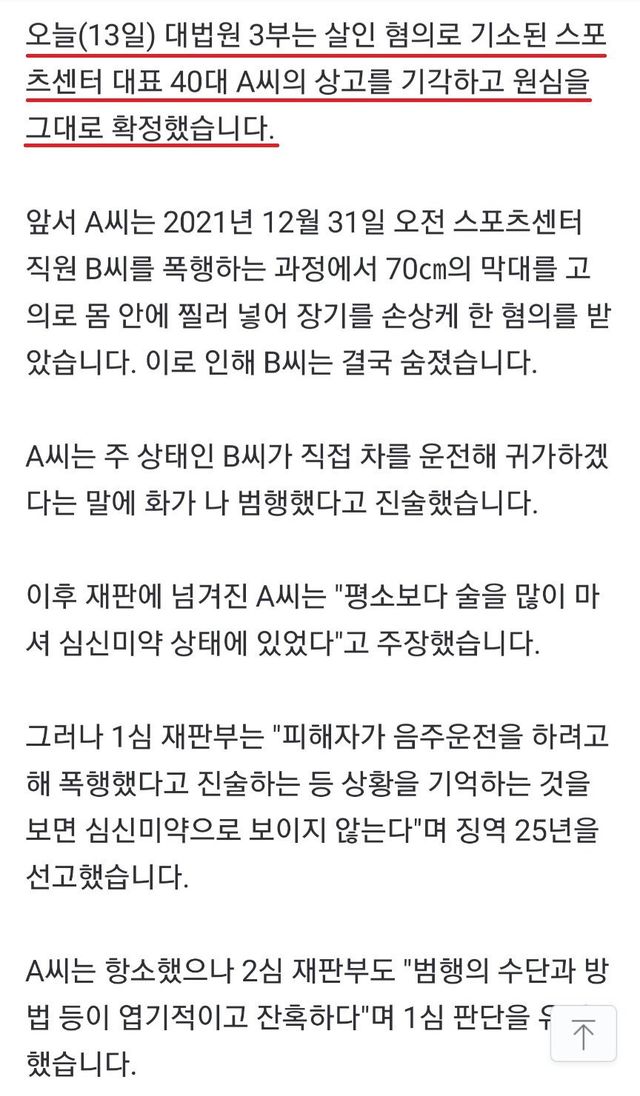 대법원 “A씨가 출동한 경찰관에게 범행을 숨기고 경찰을 돌려보낸 점, 경찰이 돌아간 뒤 피해자의 목에 손을 대 보고 맥박을 확인한 점 등을 볼 때 A씨가 범행 당시 사물을 변별할 능력이나 의사를 결정할 능력이 미약한 상태에 있었다고 볼 수 없다” , “A씨의 죄질, 피해자와 그 유족들이 입은 피해, 범행의 내용과 방법이 엽기적이고 잔혹한 점 등을 고려하면 원심의 양형이 과중하지 않다” 25년 확정