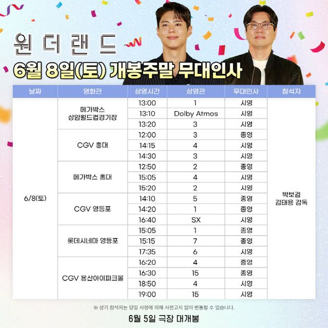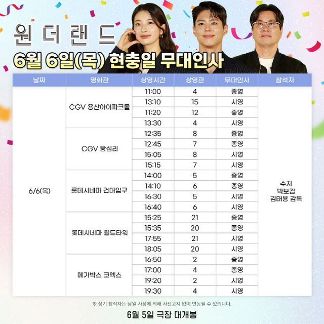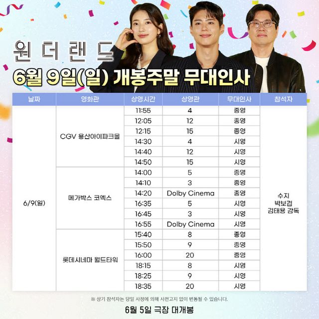 ‘원더랜드’에서 연인으로 첫 연기 호흡을 맞추며 팬들의 뜨거운 지지를 받고 있는 수지, 박보검과 연출을 맡은 김태용 감독이 6월 5일(수) 개봉을 맞아 관객맞이에 나선다. 먼저 6월 6일(목) 현충일 무대인사는 수지, 박보검, 김태용 감독이 CGV 용산아이파크몰을 시작으로 CGV 왕십리, 롯데시네마 건대입구, 롯데시네마 월드타워, 메가박스 코엑스를 차례로 방문해 개봉을 손꼽아 기다려온 관객들에게 풍성한 팬 서비스를 선사할 예정이다.