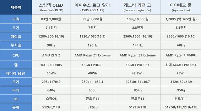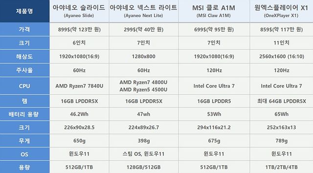 이에 따라 수많은 기업들이 UMPC 제작에 뛰어들었다.. 작년 6월 에이수스가 출시한 ROG 얼라이부터, 레노버의 리전 고, 보급형 UMPC인 아야네오 넥스트 라이트까지 다양한 제품이 뒤를 이었다. 현재 시장은 '대세는 이것'이라는 절대강자 없이 다양한 제품군이 혼재하는, 그야말로 춘추전국시대라는 말이 어색하지 않은 상황이다. 그런 의미에서 가격이나 성능, 배터리, 무게, 해상도 등 각 부문 별 경쟁력 있는 제품들은 무엇이 있는지 정리해보았다.