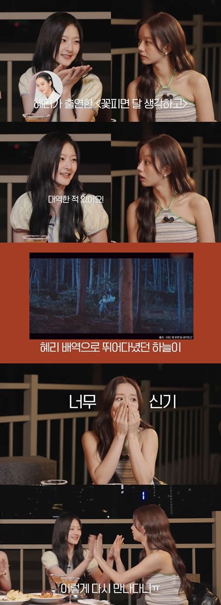 하늘은 "데뷔 전에 17살 때인가 그때 보조 출연 같은 걸 다녔었다"라며 "그때 막 뛰는 씬이 있었는데 숲 속에서 뛰고 우물도 있었다. 거기서 혜리 언니 뛰는 걸 대역 했었다"라고 전했다.