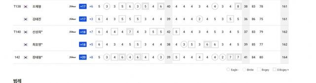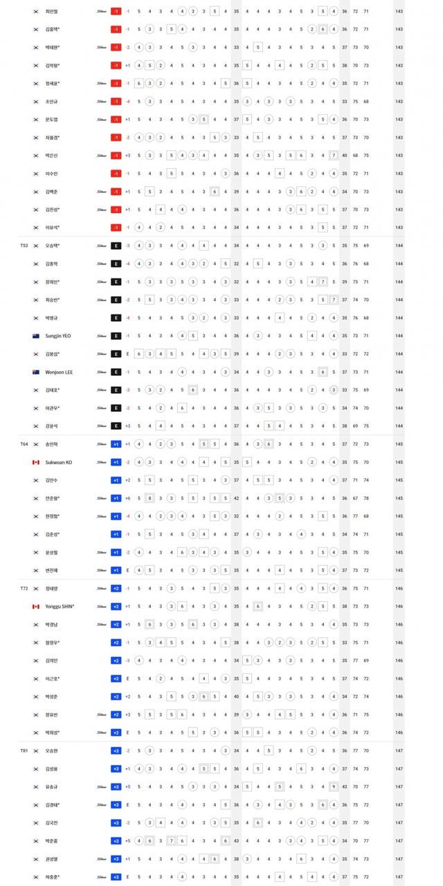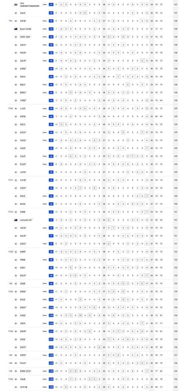 컷탈락 T64.송민혁-안준형-현정협-윤상필-변진재 +1, T72.신용구-함정우-장유빈 +2, T81.김경태-박준홍-구너성열-재즈 제인와타난너드-김승민 +3, T91.김동민-박상현-김승혁-송재일-정찬민-황중곤 +4, T111.조우영-이창우 +6, T115.이준석-서요섭 +7, T120.임예택 +8, 124.김태훈 +9, T125.이재경-서형석 +10