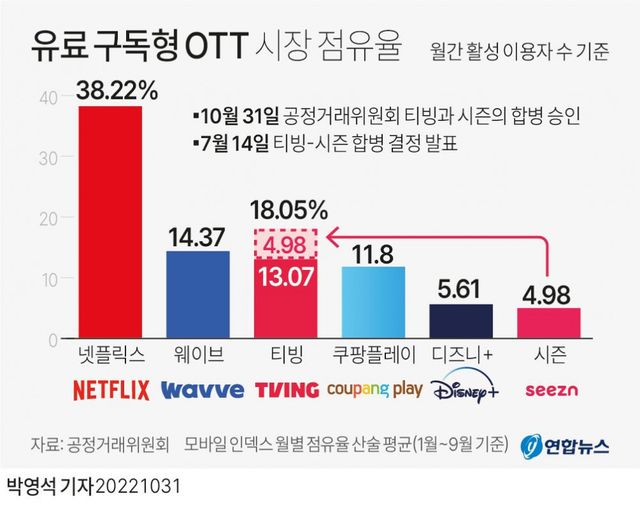 티빙이 KT시즌(seezn 이라고 KT가 만든 OTT있음)인수 하면서 2위