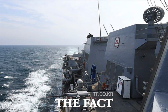 미 해군이 제공한 사진으로 알레이버크급 유도미사일 구축함 할시호가 지난 8일 대만해협에서 정기 통행작전을 실행하고 있는 모습. /AP=뉴시스