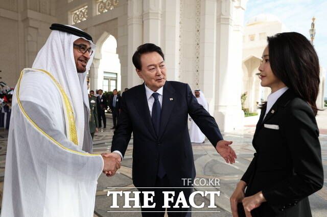 2023년 1월 15일(현지시간) UAE를 국빈 방문 중인 윤석열 대통령이 15일(현지시간) 아부다비 대통령궁에 도착해 모하메드 빈 자이드 알 나하얀 대통령에게 김건희 여사를 소개하고 있다. 김 여사는 UAE 대통령 국빈 방문 환영식 등에 참석할 것으로 보인다. /대통령실 제공
