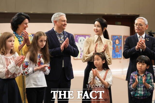 윤석열 대통령 부인 김건희 여사가 21일 청와대 춘추관에서 열린 '희망을 그리는 아이들: 우크라이나 아동 그림전'을 찾아 드미트로 포노마렌코 주한우크라이나 대사, 유인촌 문화체육관광부 장관 등과 함께 전시회 개회에 대한 사회자의 설명을 들으며 박수를 치고 있다. 김 여사의 외부 단독 일정은 지난해 11월 이후 6개월 만이다. /대통령실 제공