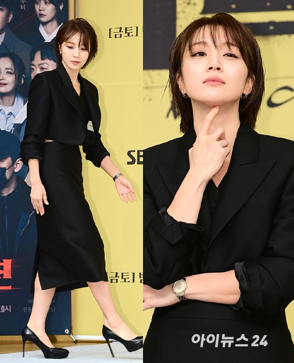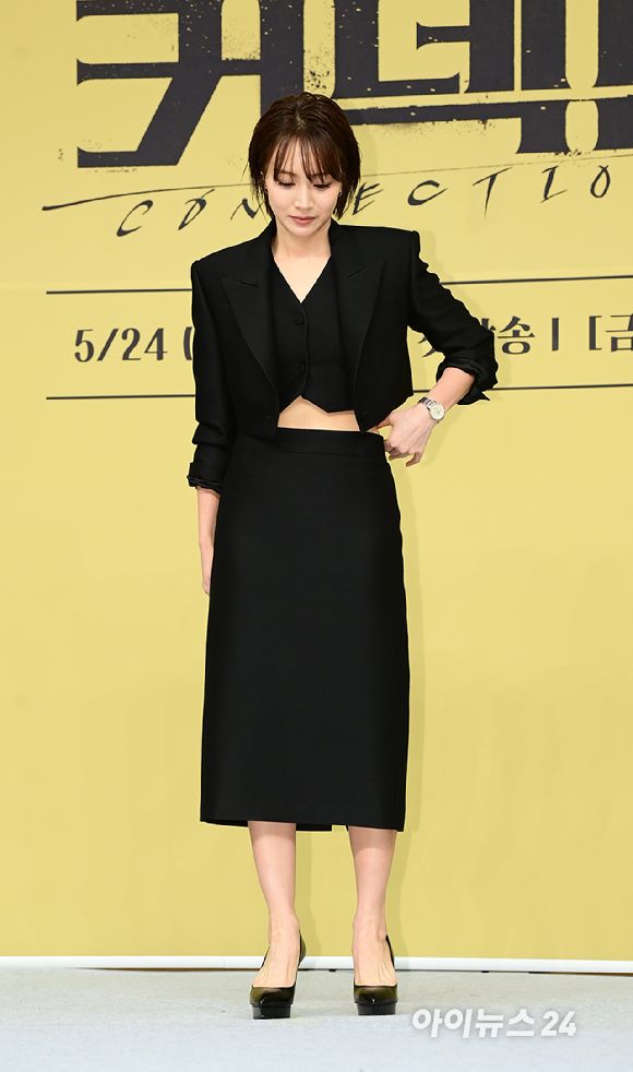'블랙 셋업까지 완벽' 배우 정유민이 24일 오후 서울 목동 SBS 사옥에서 진행된 SBS 새 금토드라마 '커넥션' 제작발표회에 참석하고 있다. [사진=정소희 기자]