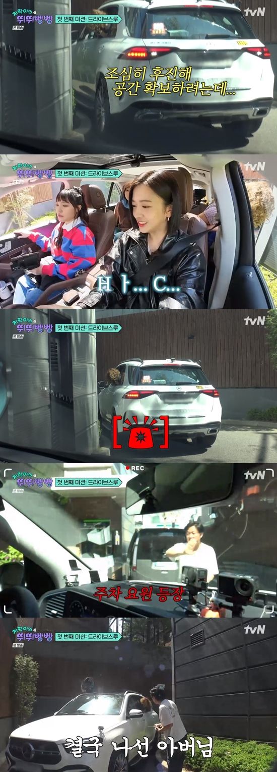 드라이브 스루에 도착한 안유진은 코너를 돌던 중 난관에 봉착했다. 타이어가 연석 위로 올라가 버린 것. 이에 나PD가 등장해 운전을 조언했다.