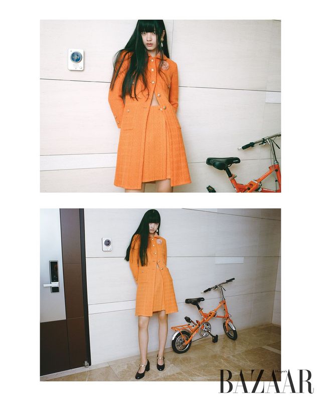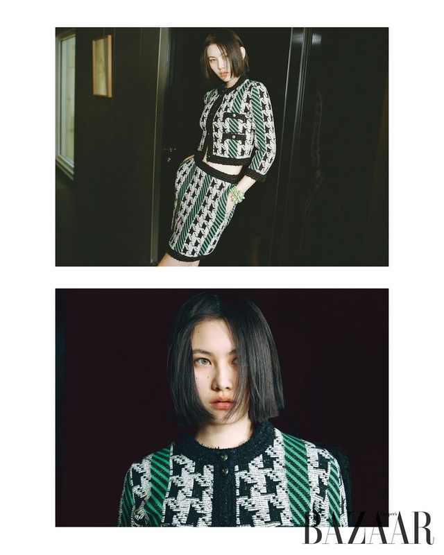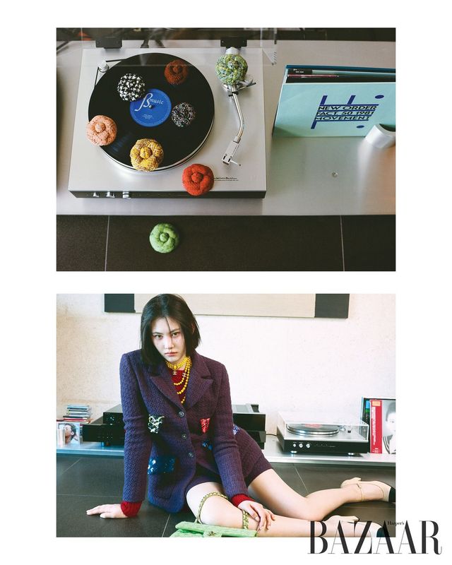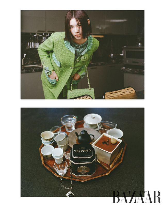 재킷, 스커트, 팔찌는 모두 Chanel.
