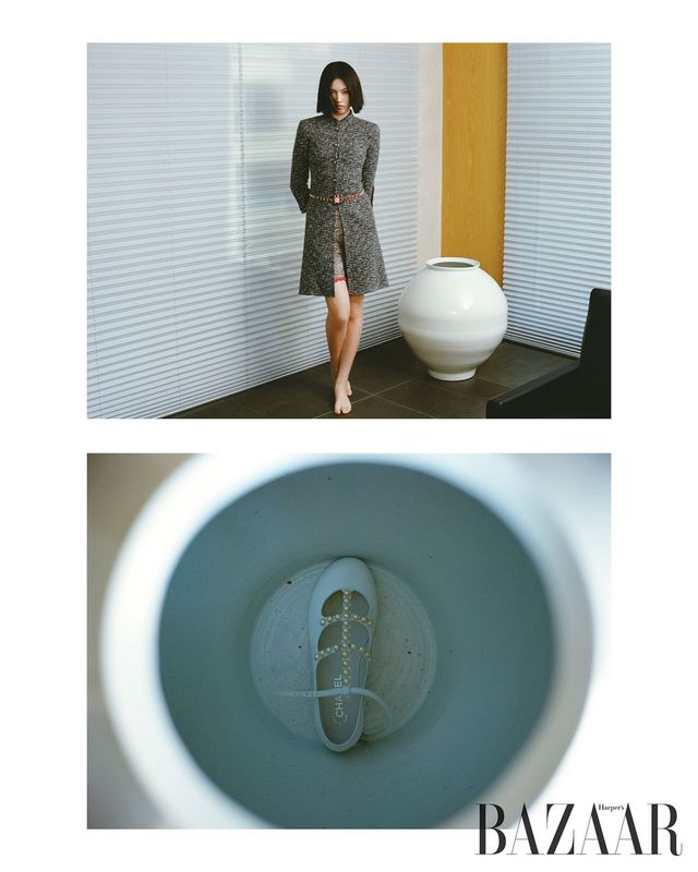 트위드 코트, 스커트, 귀고리, 까멜리아 브로치, 메리제인 슈즈는 모두 Chanel.