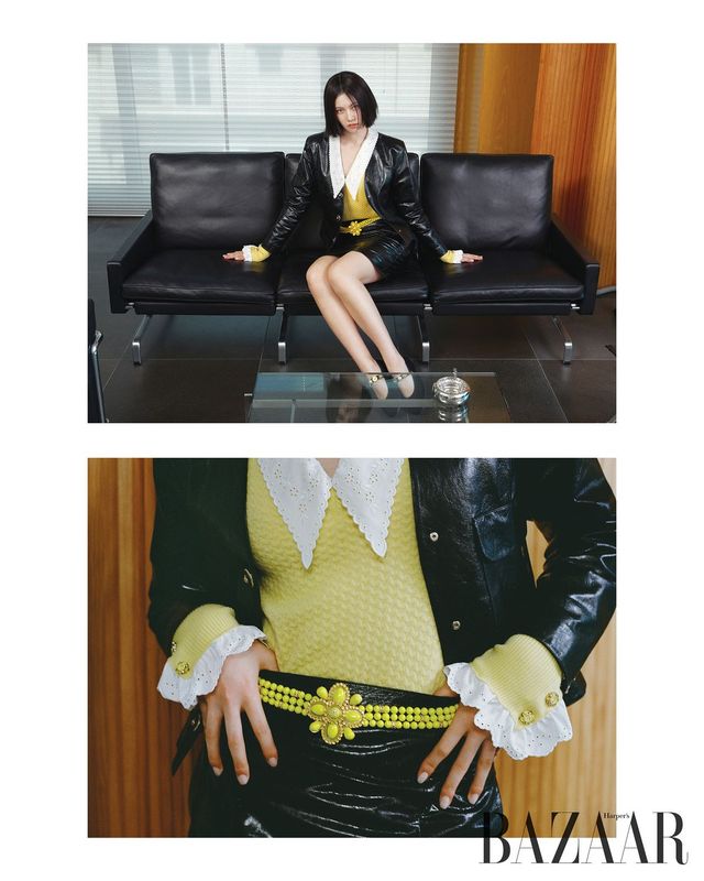 레더 재킷, 레이스 디테일의 니트 톱, 레더 스커트, 벨트, 슈즈는 모두 Chanel.