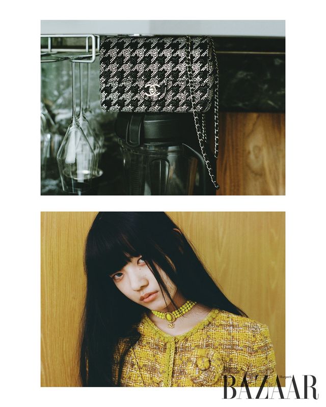 재킷, 톱, 스커트, 까멜리아 브로치, 팔찌, ‘11.12’ 백, 티 박스 모티프의 퀼팅 백은 모두 Chanel.