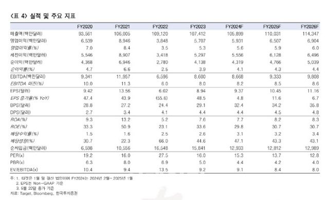 전예원 한국투자증권 연구원은 25일 “타겟의 2024년 회계연도 1분기(2~4월) 매출액은 전년 대비 3.1% 감소한 245억달러, 영업이익은 전년보다 2.4% 줄어든 13억달러, 주당순이익(EPS)은 전년 대비 1% 감소한 2.03달러를 기록했다”며 “매출액과 EPS 모두 시장 기대치에 부합했다”고 밝혔다.