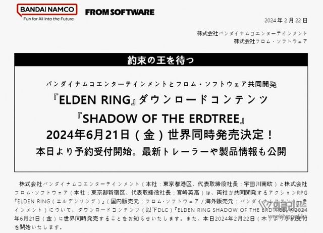 ▲ 반다이 남코는 엘든링 DLC 확장판을 6월 21일 정식 발매한다고 공지했다.