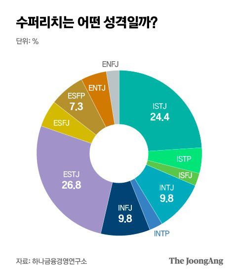 9일 하나은행 하나금융경영연구소가 발간한 ‘대한민국 웰스 리포트’에 따르면 ‘수퍼리치’(금융 자산 100억원 이상 또는 총자산 300억원 이상)의 MBTI 검사 결과 ‘ESTJ’로 나온 사람의 비중(26.8%)이 가장 높았다. MBTI는 성격유형검사의 일종인데, ESTJ는 외향형(E)·감각형(S)·이성적(T)·계획적(J) 성격을 의미한다. 일반인 중에서는 ESTJ는 8.5%에 불과했지만, 수퍼리치는 이와 비교해 3배가 넘었다.
