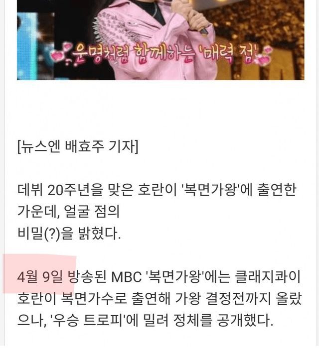 복면가왕에서 음주 3범 호란이 나와서 데뷔 20주년이라고 신나게 방송함.