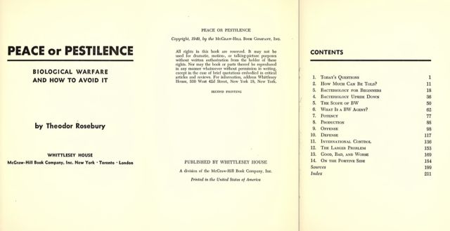 로즈버리는 일찍이 미국의 세균전쟁 준비가 세계평화에 위협적일 수 있다고 걱정했다. 한국전쟁이 터지기 1년 전인 1949년 <평화인가 페스트인가>(Peace or Pestilence)란 책을 내면서 세균무기 자체를 거세게 비난했다. '생물전쟁과 그 회피 방법'이란 부제목을 붙인 책에서 로즈버리는 이렇게 경고했다. "만에 하나 본격적으로 세균전이 벌어질 경우 그 피해가 어느 정도가 될지 예측이 어렵고, 통제 자체가 불가능하기에 매우 위험하다"(구글 검색란에서 'Peace or Pestilence'를 치면 로즈버리의 책 원문을 볼 수 있다).