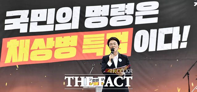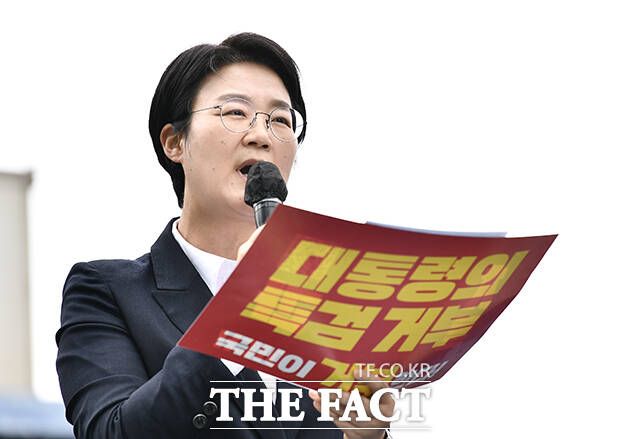 [더팩트ㅣ박헌우 기자] 윤희숙 진보당 상임대표가 25일 오후 서울 중구 세종대로에서 열린 '해병대원 특검법 거부 규탄 및 통과 촉구 범국민대회'에 참석해 발언하고 있다.