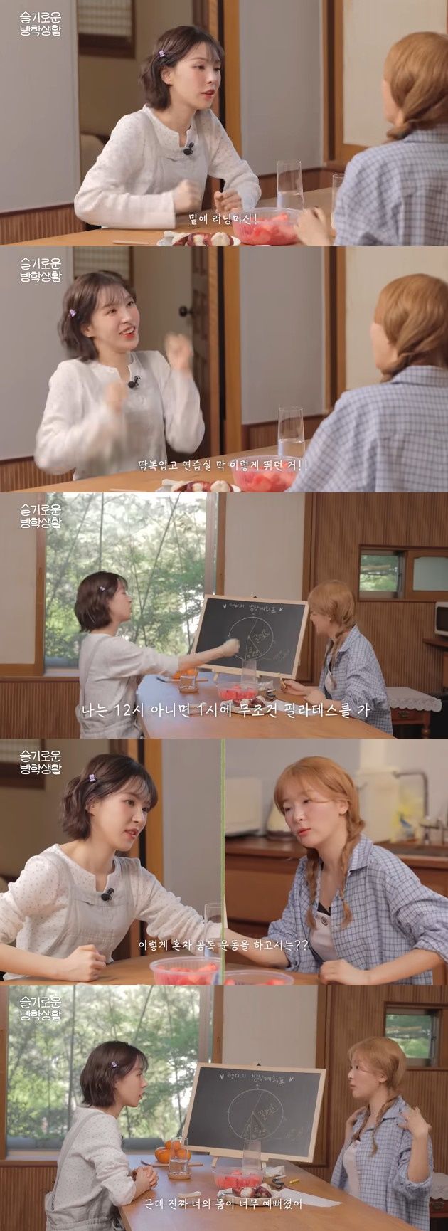 슬기는 "유산소를 그러면 그냥 동네를 뛰는 거냐"고 물었고 웬디는 "땀복 입고 런닝머신을 뛰러 간다. 그렇게 하면 너무 개운하고 좋더라. 그리고 나는 12시 아니면 1시에 무조건 필라테스를 간다"며 쉴 틈 없는 자기 관리 일정을 공유했다.
