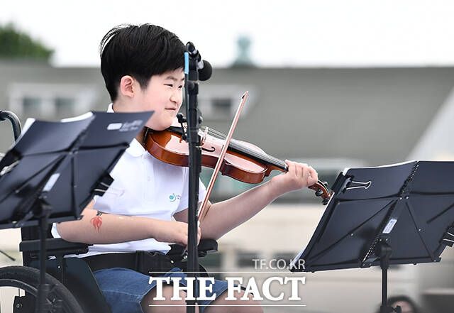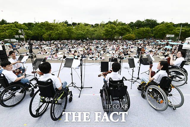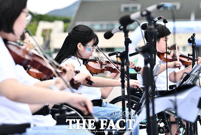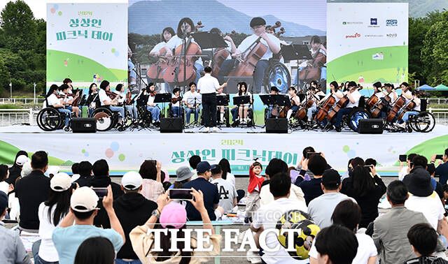 [더팩트|하남=박헌우 기자] 상상휠 하모니 오케스트라 단원들이 25일 오전 경기 하남시 미사경정공원에서 열린 상상인 그룹 ‘2024 피크닉데이’에 참석해 멋진 연주를 펼치고 있다.