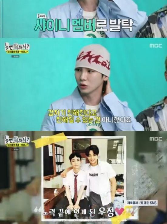 이에 리더 온유는 "민호랑 키는 뭐든 뚫는 창과 뭐든 막는 방패와 같았다"고 말해 공감을 자아냈다. 키는 "데뷔 전에 싸우기도 했다. 같이 데뷔하게 될 줄 몰랐다"고 회상했다.