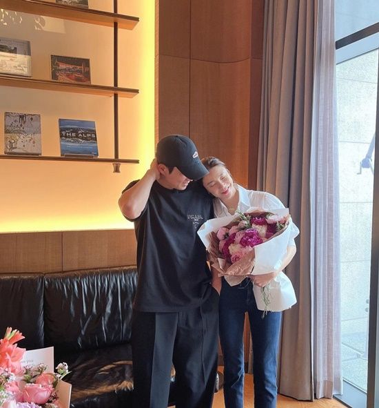 공개된 사진 속 차예련은 본인의 몸집보다 큰 꽃다발을 들고 남편 주상욱의 어깨에 기대 행복한 모습이다.