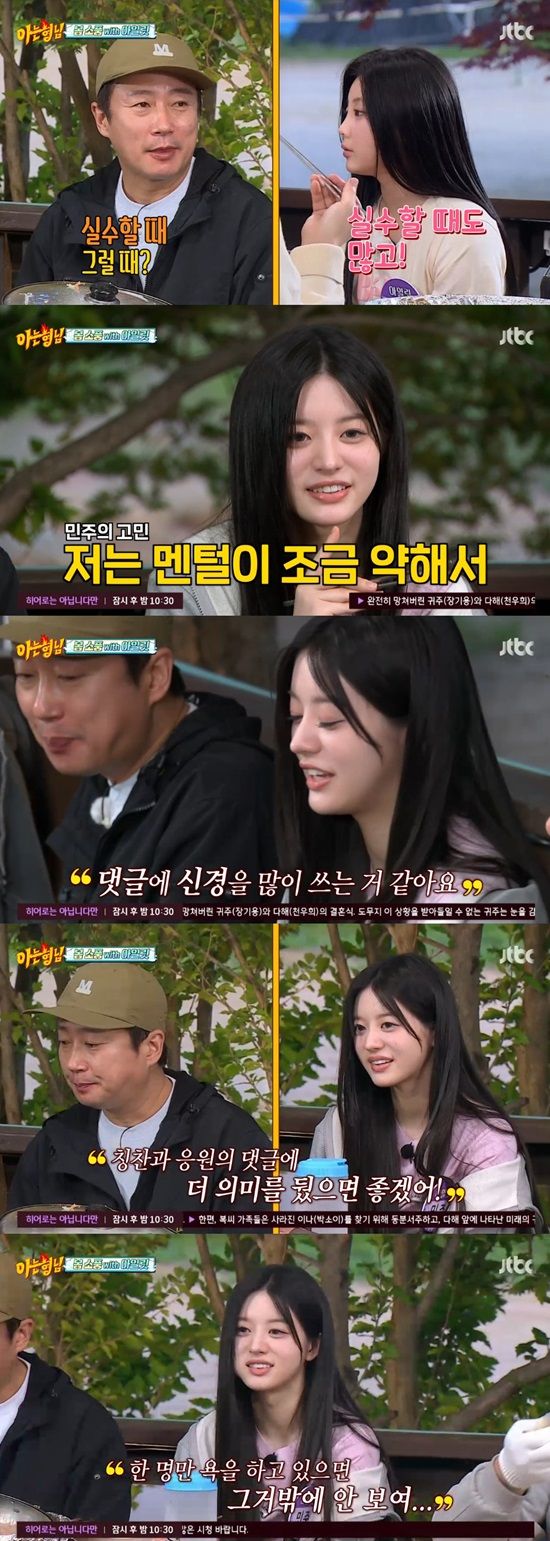 이어 민주는 "멘탈이 약하다. 댓글보면 깊이, 많이 빠지는 거 같다"고 털어놨다. 이를 들은 형님들은 "안 봤으면 좋겠다", "백개의 칭찬 있어도 하나 안 좋은 말 보면 거기에 꽂힌다"고 답했다.