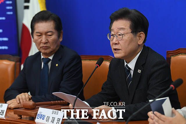 예상 밖의 국회의장 후보 경선 결과로 대규모 탈당 사태를 마주한 더불어민주당이 당원 권한을 강화하기로 뜻을 모았다. 24일 열린 최고위원회의에서 발언하는 이재명 대표의 모습. /남윤호 기자