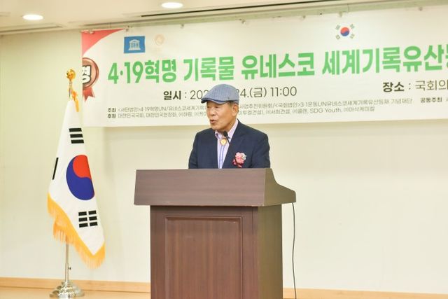 | 4·19혁명 기록물 유네스코세계기록유산등재 인증서 전달식이 지난 24일 오전 11시 여의도 국회의원회관 제2소회의실에서 개최됐다. 김영진 이사장이 기념사를 하고 있다. / 사진=4·19혁명UN유네스코세계기록유산등재 및 기념사업추진위원회 |