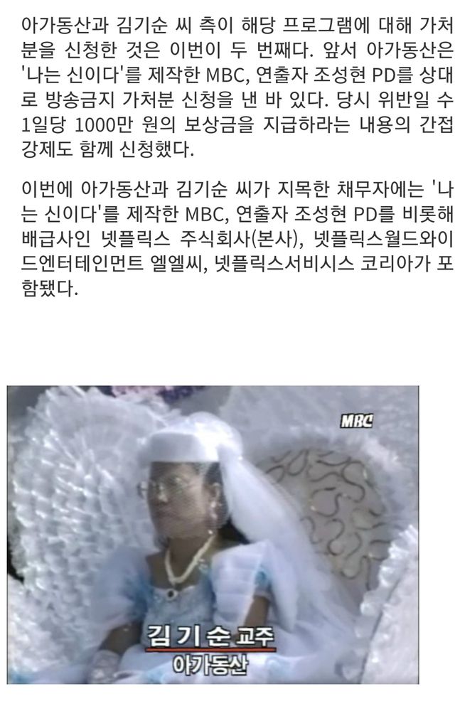 [단독] 아가동산, 美 넷플릭스 본사 상대로 ‘나는 신이다’ 방송금지 가처분 신청