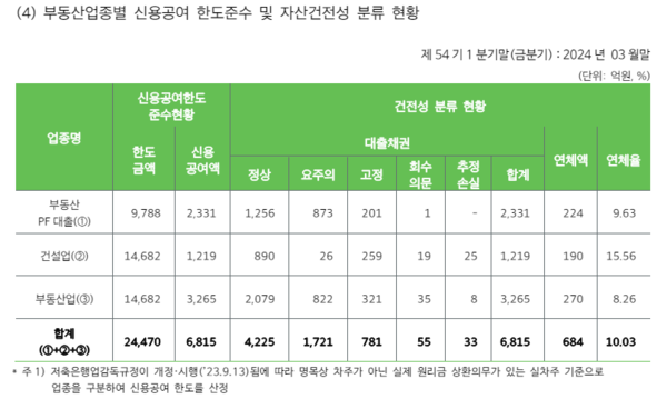 다만 부동산PF 리스크는 여전히 골칫거리 남았다. 부동산 업종별 신용공여 한도준수 및 자산건전성 분류 현황을 보면 1분기 말 기준, 부동산PF 대출은 총액은 2331억원으로 정상 등급 1256억원, 요주의 등급 873억원, 고정 201억원, 회수의문 1억원 등으로 구성됐다.
