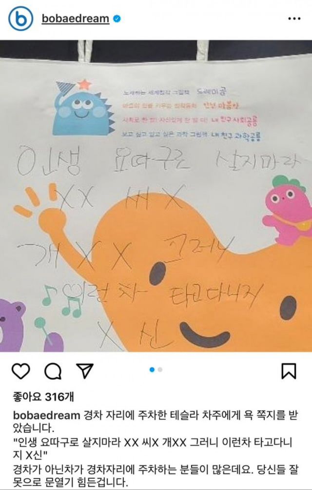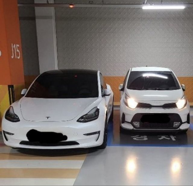 테슬라 차주가 옆에 주차한 경차 차주에게 쪽지보냄(경차 주차 구역임)