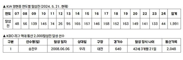 한편 양현종은 KBO 리그 개인 최다 탈삼진 기록에도 근접했다. 현재 기록을 보유하고 있는 송진우의2,048개에도 57개 차로 근접해 이번 시즌 대기록 경신이 가능하다. 또한 2014 시즌부터 2023시즌까지 9시즌 연속 세자릿 수 탈삼진을 기록한 양현종은 탈삼진 56개를 추가하면 전 해태 이강철, 전 두산 장원준과 함께 10시즌 연속 세자릿 수 탈삼진으로 이 부문 연속 기록 최다 타이를 이루게 된다.