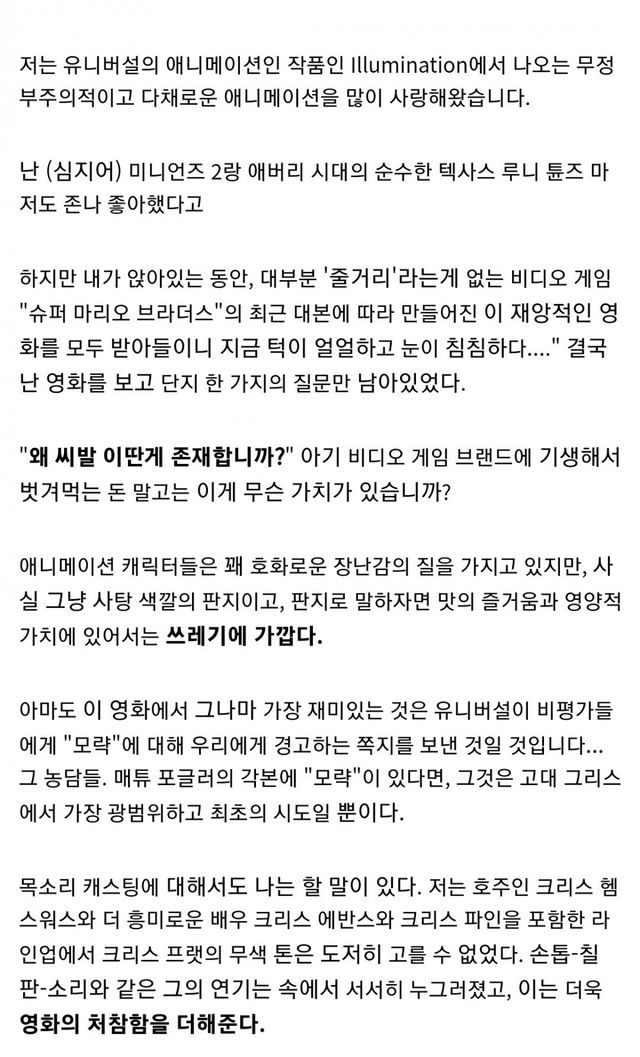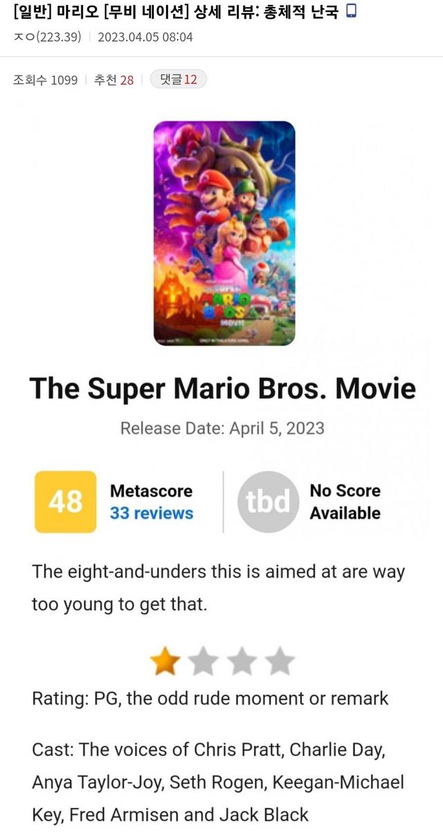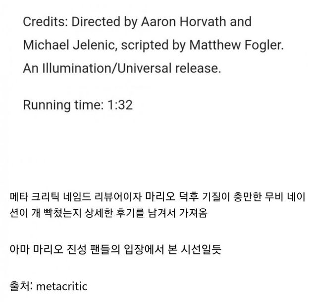 메타크리틱 네임드 리뷰어이자 마리오팬인 무비네이션이 영화 보자마자 개빡쳤는지 메타크리틱과 무비네이션 홈페이지에 평점 1점과 장문의 리뷰글을 남김