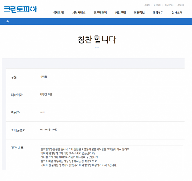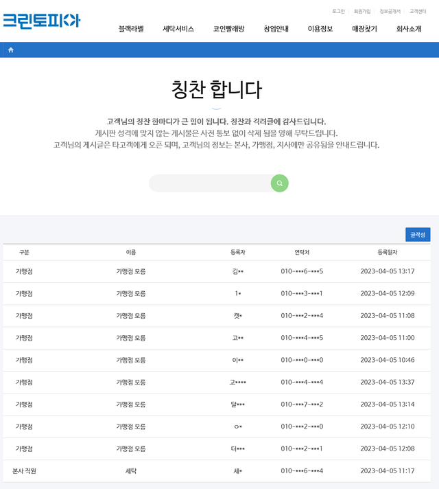 활성화 된 게시판은 따로 없고 가맹점혹은 본사직원을 칭찬하는 게시판이 있는데