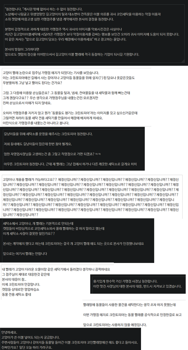 노상에 깔아둔 털바퀴 이불들 빠는 캣맘들과 트러블 생긴 크린토피아 가맹점주