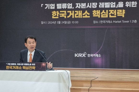정 이사장은 지난 24일 거래소 대회의실에서 취임 100일 기념 기자간담회를 열고 '기업 밸류업, 자본시장 레벨업'을 주제로 향후 거래소의 핵심전략 추진방향을 발표하고 현안에 대한 질문에 답했다.