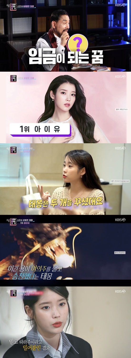 또 아이유는 두 마리의 용이 서로 싸우다가 이긴 용이 여의주를 물고 하늘로 승천했다는 태몽을 꾸기도 했다고. 소재학 교수는 “승천한다는 것은 공인이 된다는 것이다. 승천을 하면서 최종을 이루느냐는 여의주에 달렸다”고 전했다.