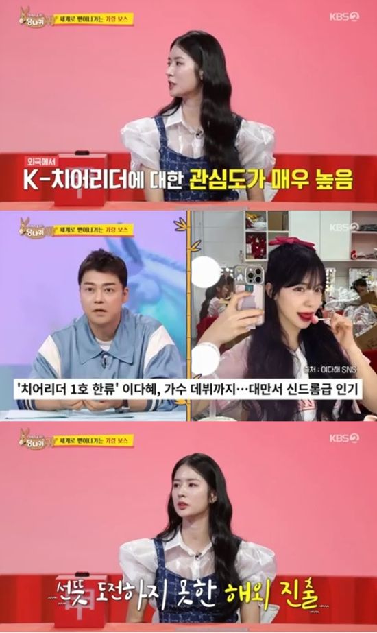 전현무는 대만에 진출한 한류 치어리더 1호인 이다혜를 언급하면서 "인기가 아이돌급이다. 광고도 12개 넘게 찍고 음반도 냈더라"라고 전했다.