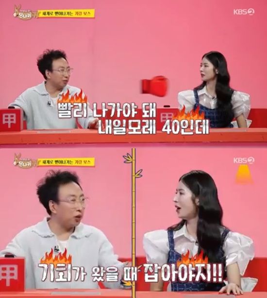 박명수는 박기량을 향해 "왜 안 가. 빨리 나가야 돼. 내일 모레 40이다. 기회가 왔을 때 잡아야지"라고 호통을 쳤다.