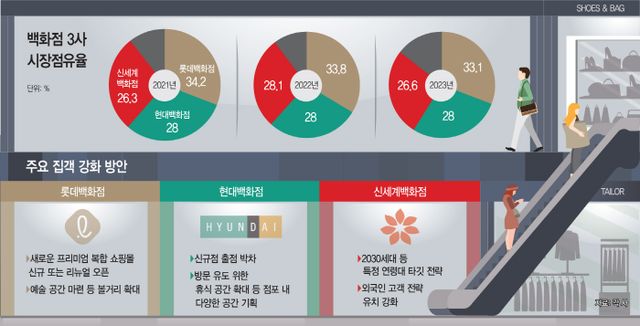 사정이 이렇게 되자 이들 백화점이 시장점유율 확보에 나서고 있는 상황이다. 물론 이들 백화점은 다양한 행사를 통해 꾸준하게 고객 유입을 위한 활동을 전개했다. 특히 롯데백화점의 경우 이대로 가만히 있으면 자부심이라 할 수 있었던 30%대 시장점유율 유지도 어려울 것으로 보고 집객 강화에 공격적으로 나설 방침이다.