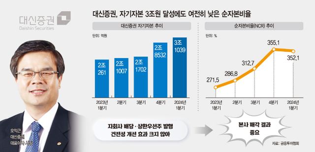 종투사 진입을 목표로 1년 사이 자기자본을 1조원 이상 늘렸음에도, NCR은 큰 변화가 없었다. 실제 대신증권은 자회사 배당금 수익 유입 효과로 인해 작년 말 자기자본이 2조8532억원으로 9월 말(2조1702억원)보다 7000억원가량 증가했다. 하지만 같은 기간 NCR은 312.7%에서 355.1%로 42.4%포인트 개선되는 데 그쳤다. 올해 상환전환우선주(RCPS) 발행으로 2300억원을 조달하며 1분기 말 자기자본 3조1039억원을 달성했지만, NCR은 352.1%로 오히려 3%포인트 하락했다.